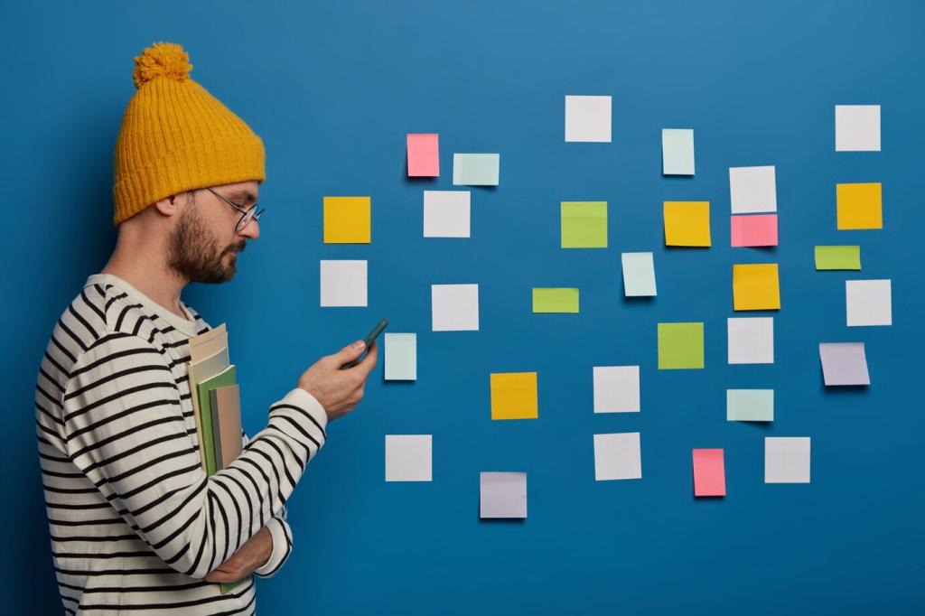 Starte mit einer Mini‑Map: drei Kreise, drei Worte, eine Intention. Dieser kurze Blick nach innen verändert Entscheidungen über den Tag hinweg – still, freundlich und erstaunlich wirksam.